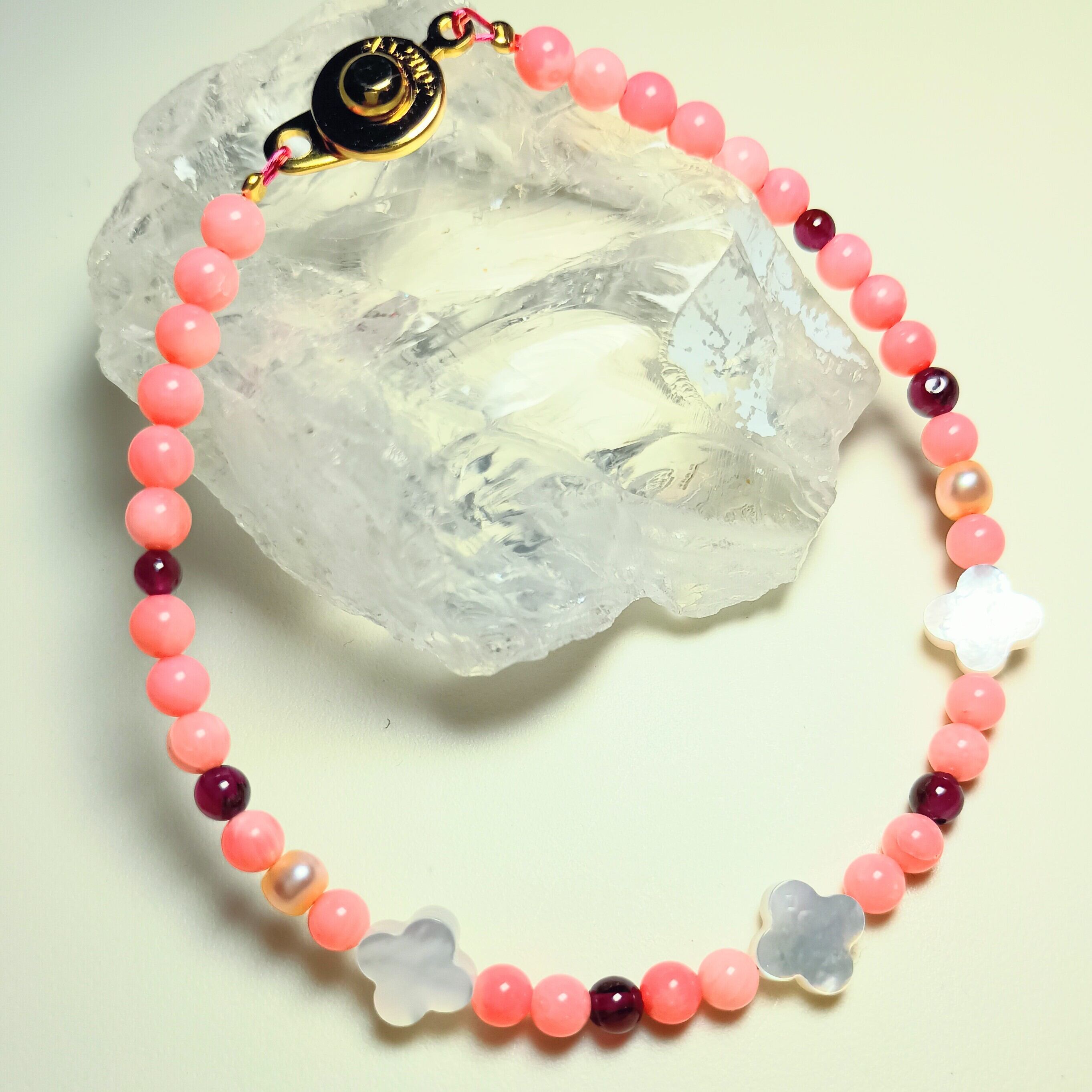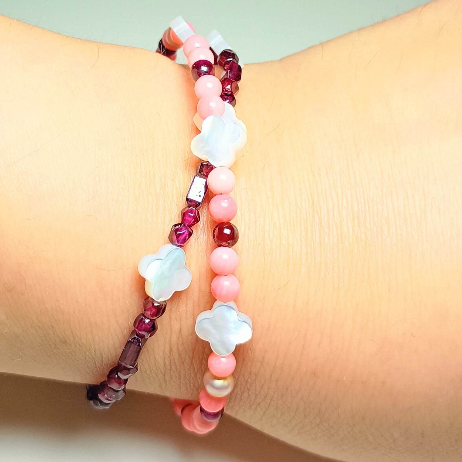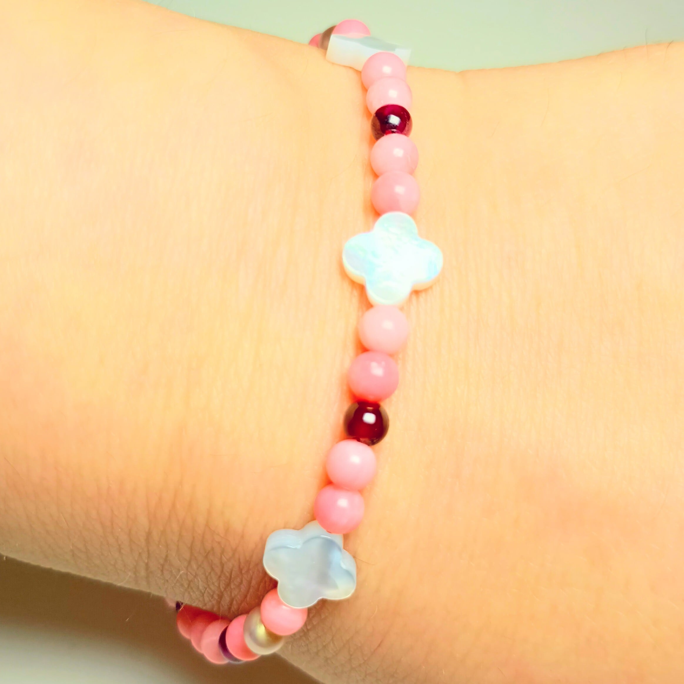 高貴な色合いで心を癒すピンクオパール、情熱を象徴するガーネット、優雅なホワイトシェルを組み合わせたブレスレットは、健康、愛情、精神の安定をサポートする特別なアイテムです☆