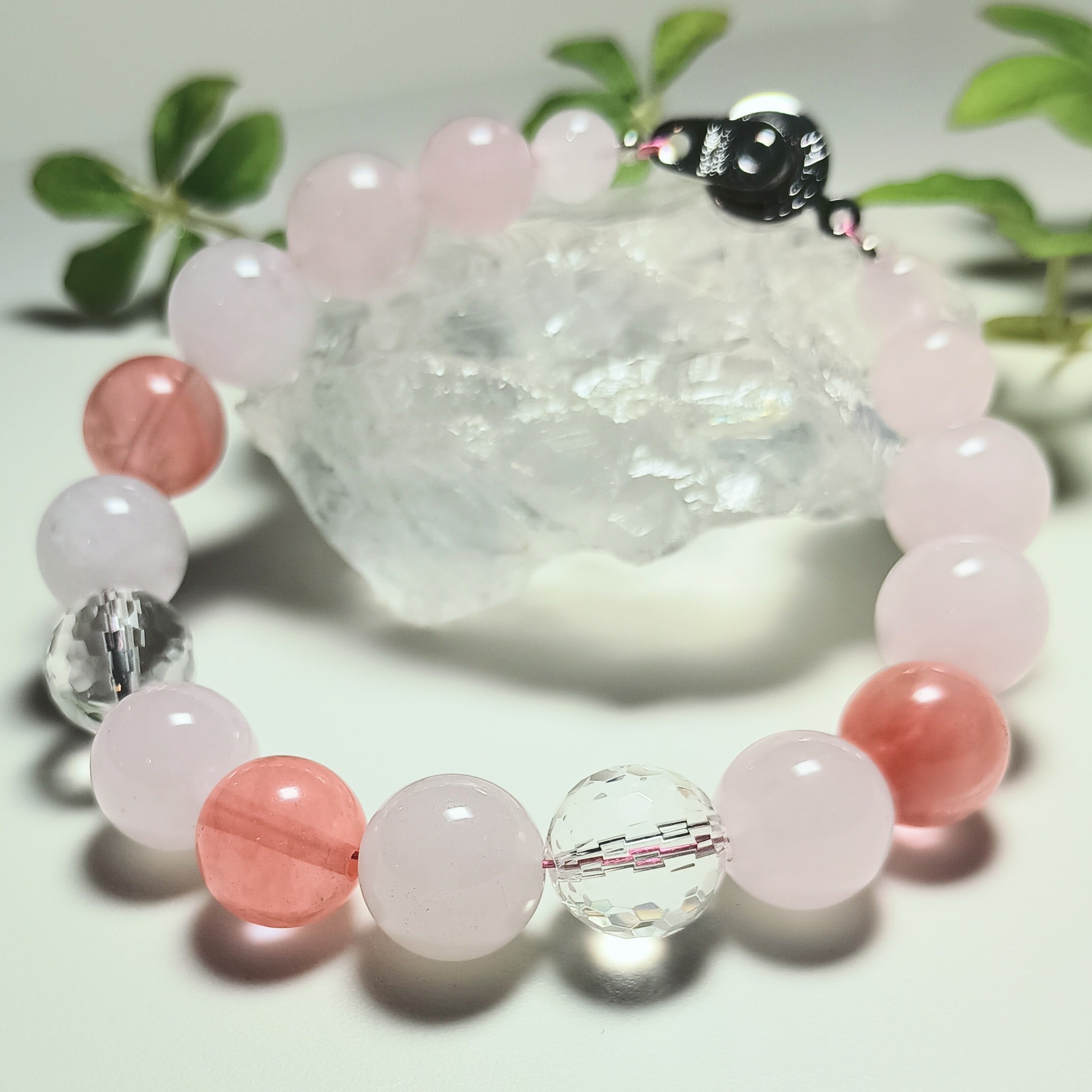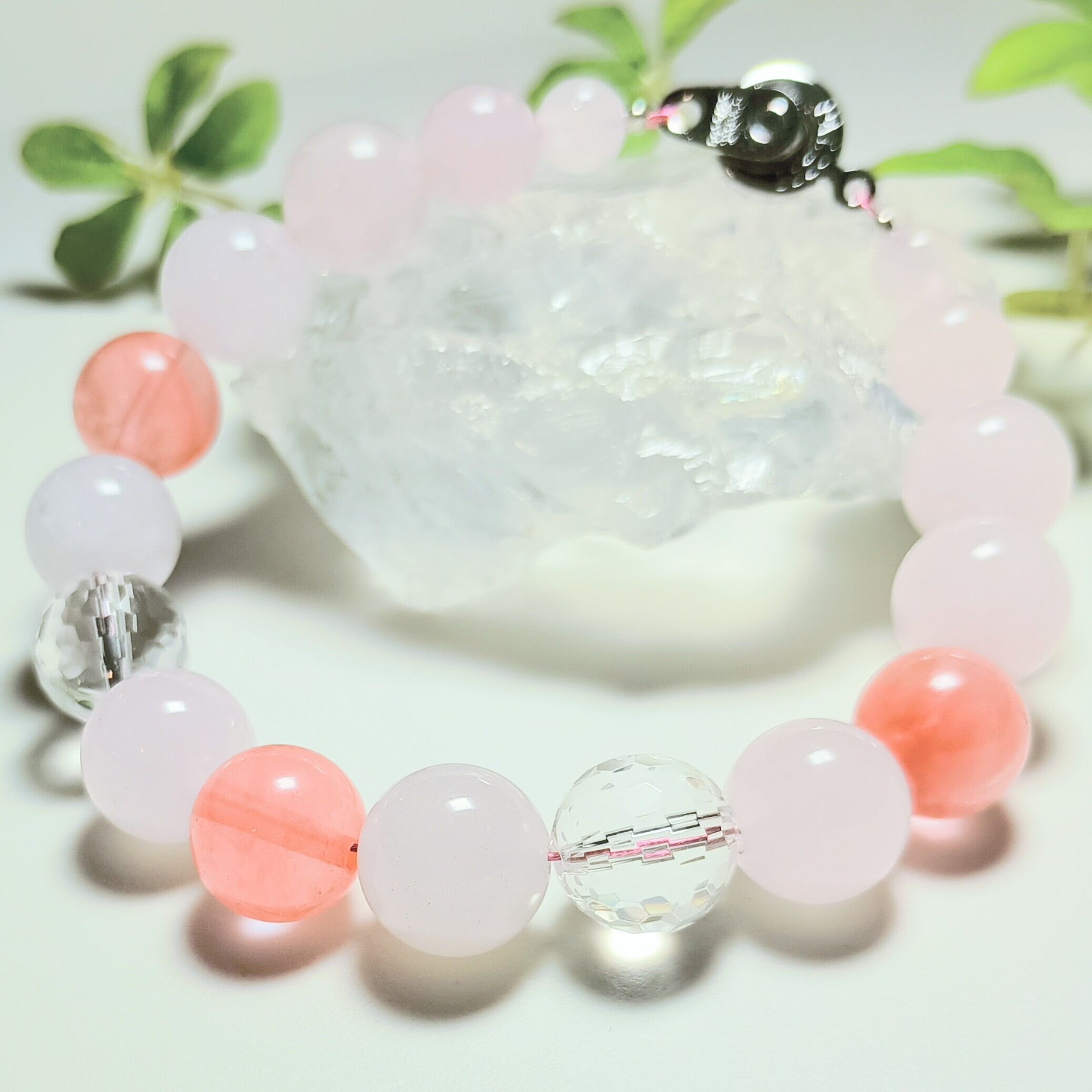 大粒10mmのローズクォーツとミラーボールカットの水晶がキラキラと輝くボリューミーなブレスレット