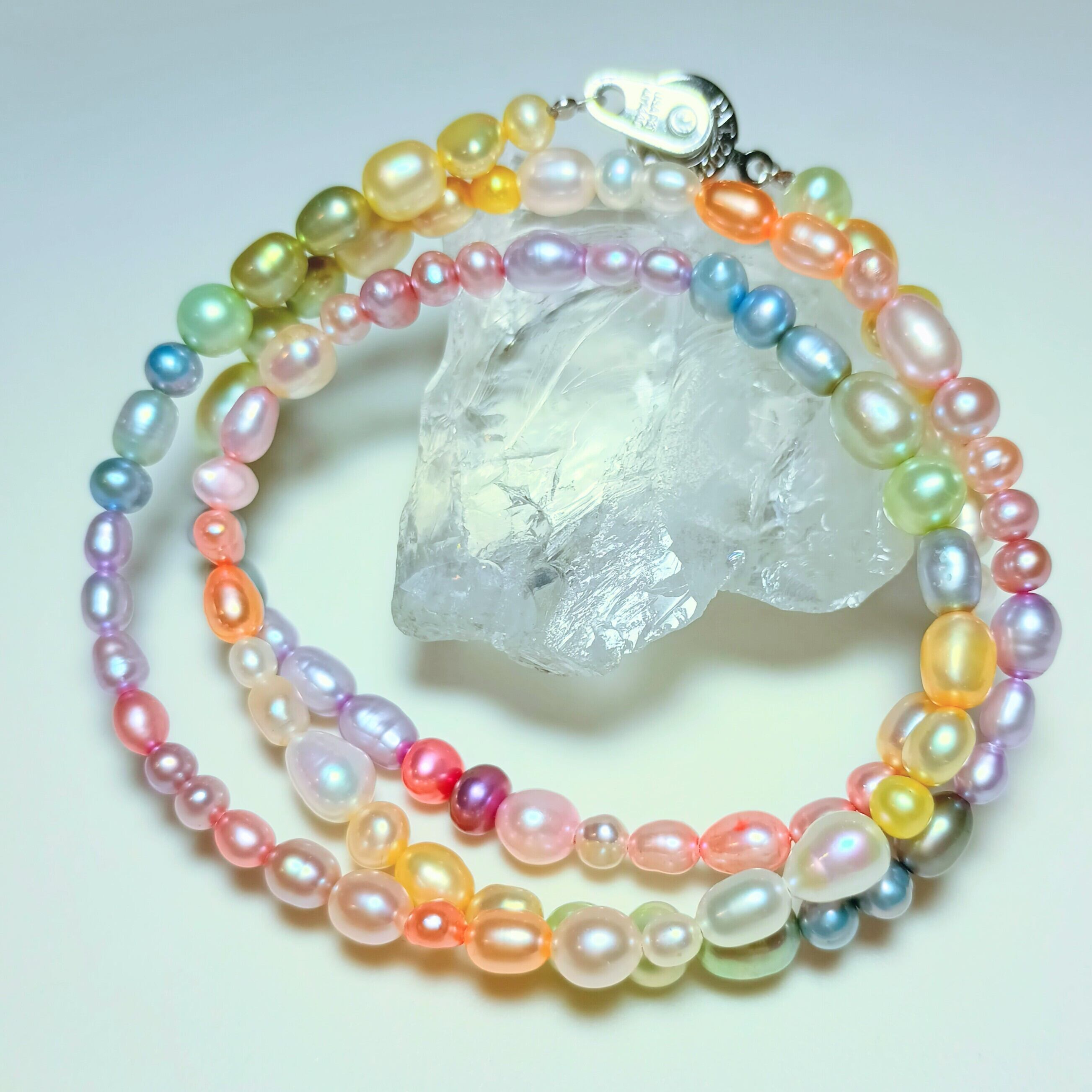 虹のように優しく輝く、淡水パールを贅沢に使用したネックレス。